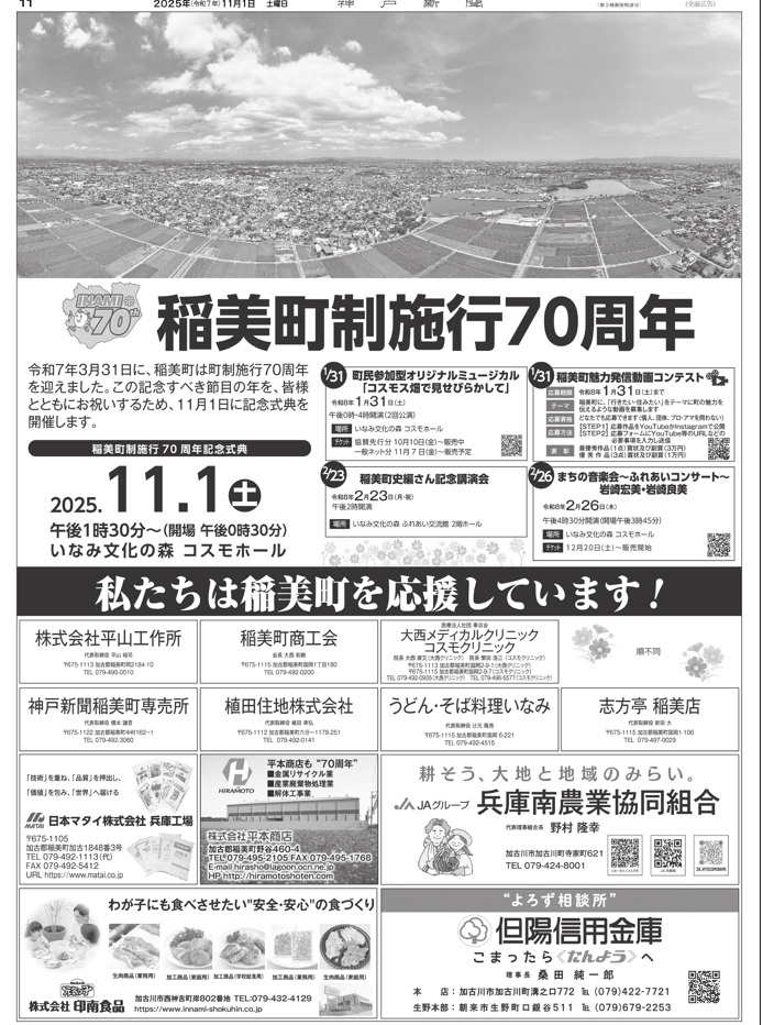 神戸新聞で、稲美町70周年の特集が展開され協賛させていただきました。